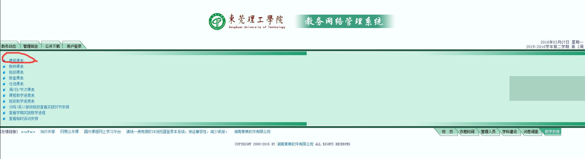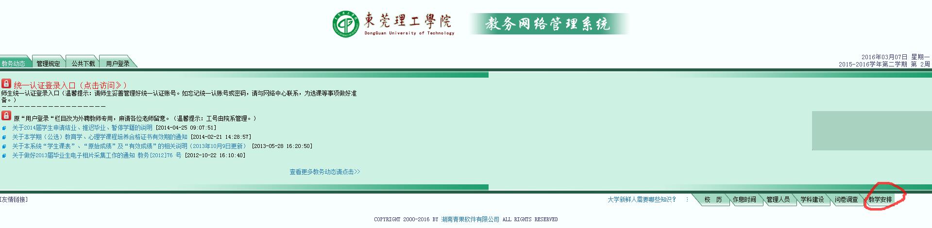 点击教务处主页右上角教务网络管理系统—点击右下角教学安排(无需登录)--点击课程课表查询。