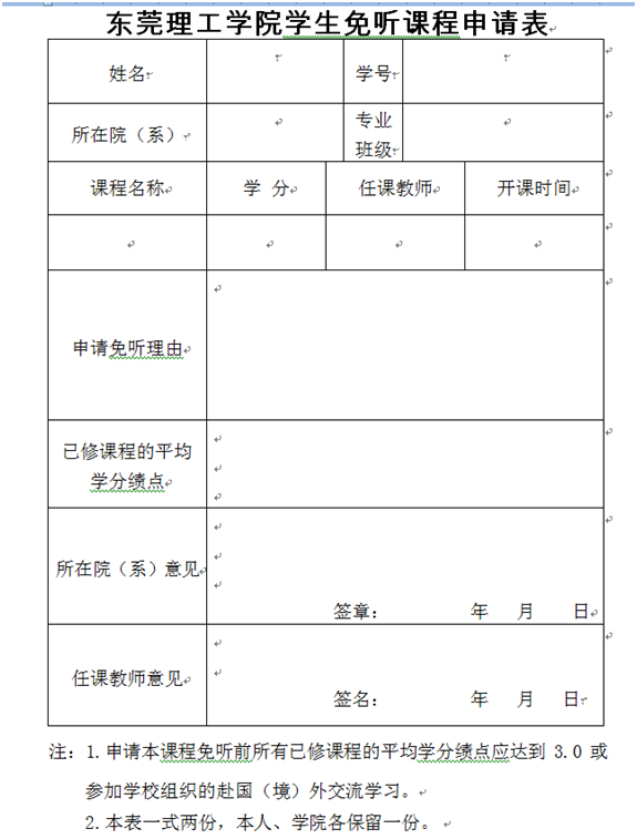 到教务处主页下载中心下载《免听申请表》,按要求填写,任课老师签名后,交本院教学秘书。一课一表,一式两份。