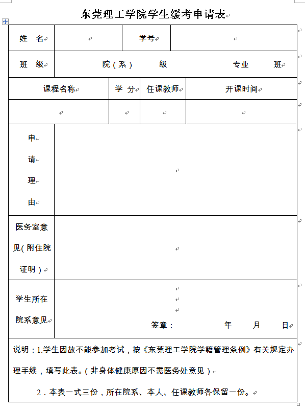 因故不能参加正常期末考试的,要在考试前提出缓考申请并附相关证明。来不及办手续的,应于考前先口头通知任课老师,考试结束2天内按程序补办完手续。任选课不设缓考。可到教务处主页下载专区下载《缓考申请表》,按要求填写,最后交本院教学秘书1份,自留1份,任课教师1份。缓考不单独安排,缓考学生需参加下一次同一课程的期末考试,如冲突则顺延。