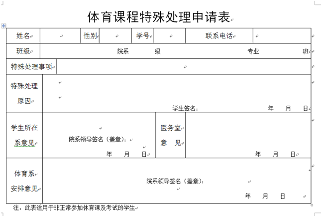 凡因身体疾病等特殊因素导致无法上体育课的,请准备病历、疾病证明,并到教务处主页“下载专区”或者本学院“下载中心”,下载《体育课特殊情况处理表》一份,按要求填写并提交。