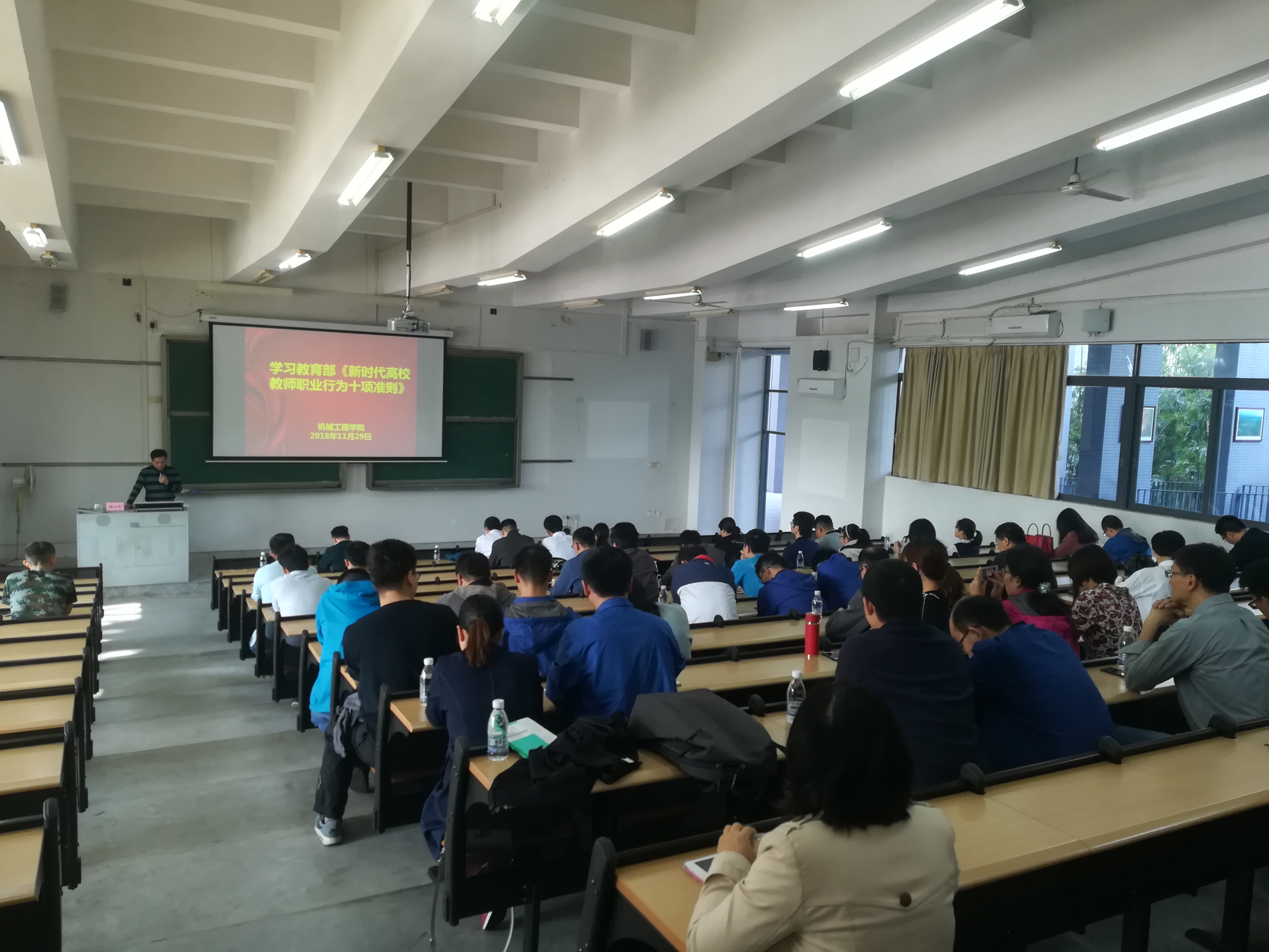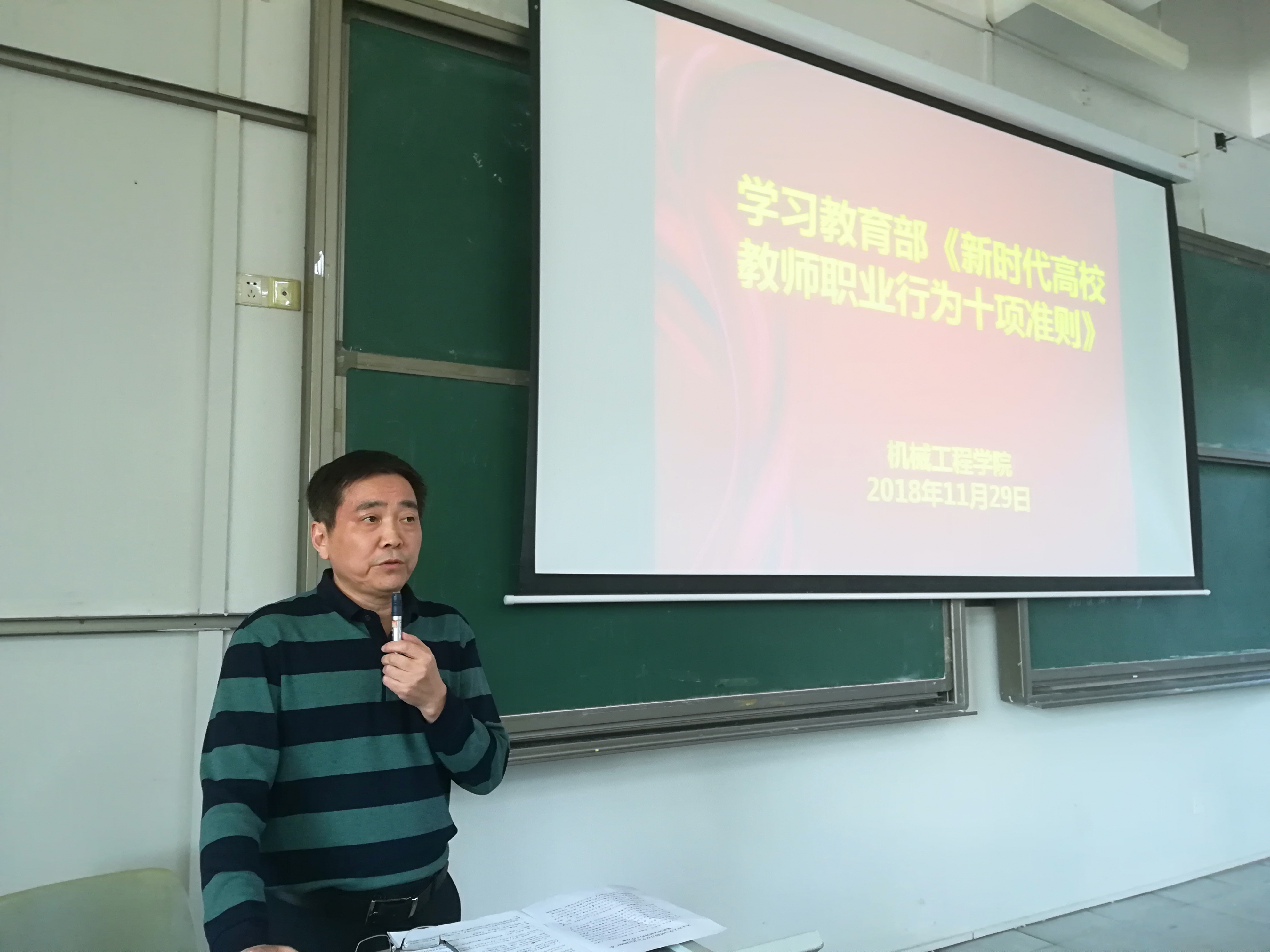2018年11月29日下午,必赢在教学楼6E206组织全院教职工学习《新时代高校教师职业行为十项准则》(以下简称“准则”),会议由党总支书记钟守炎主持。