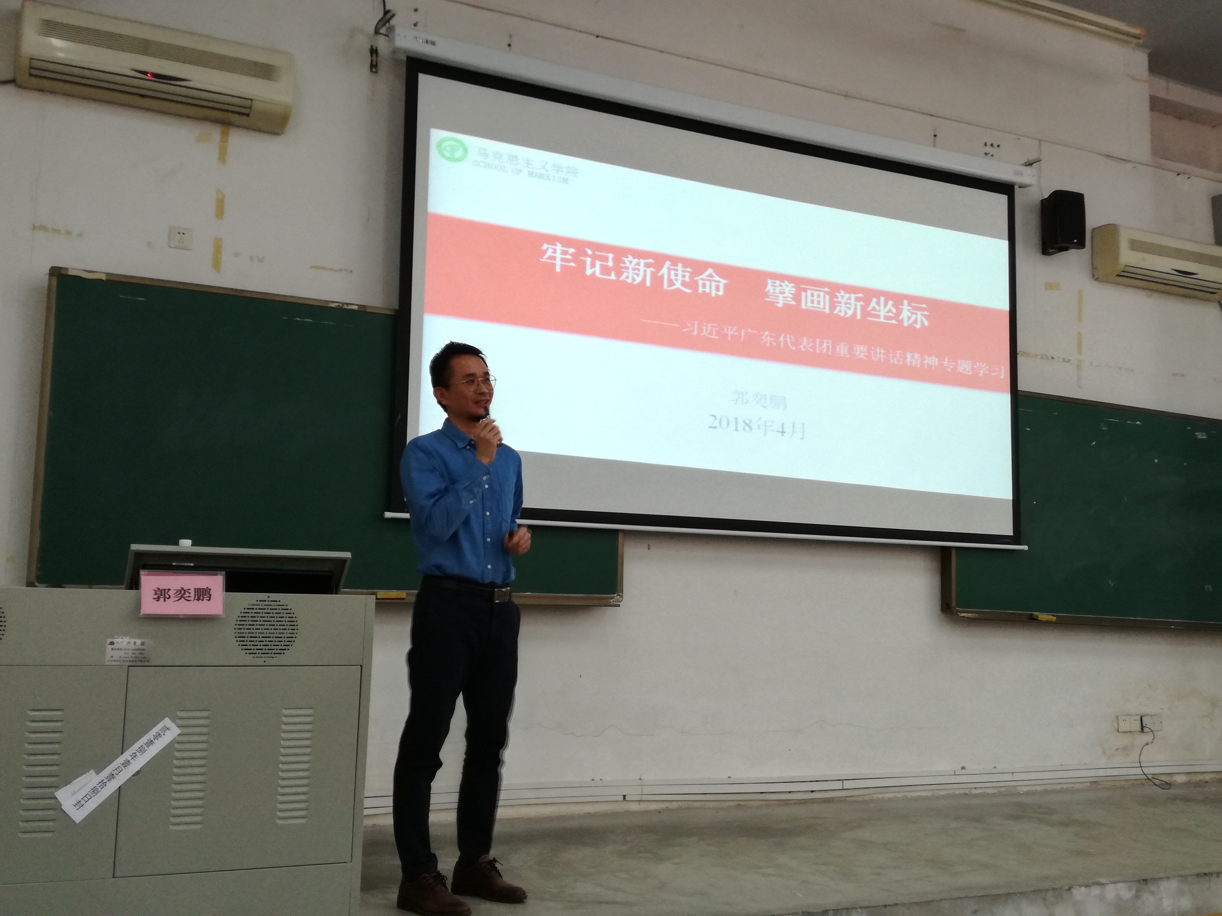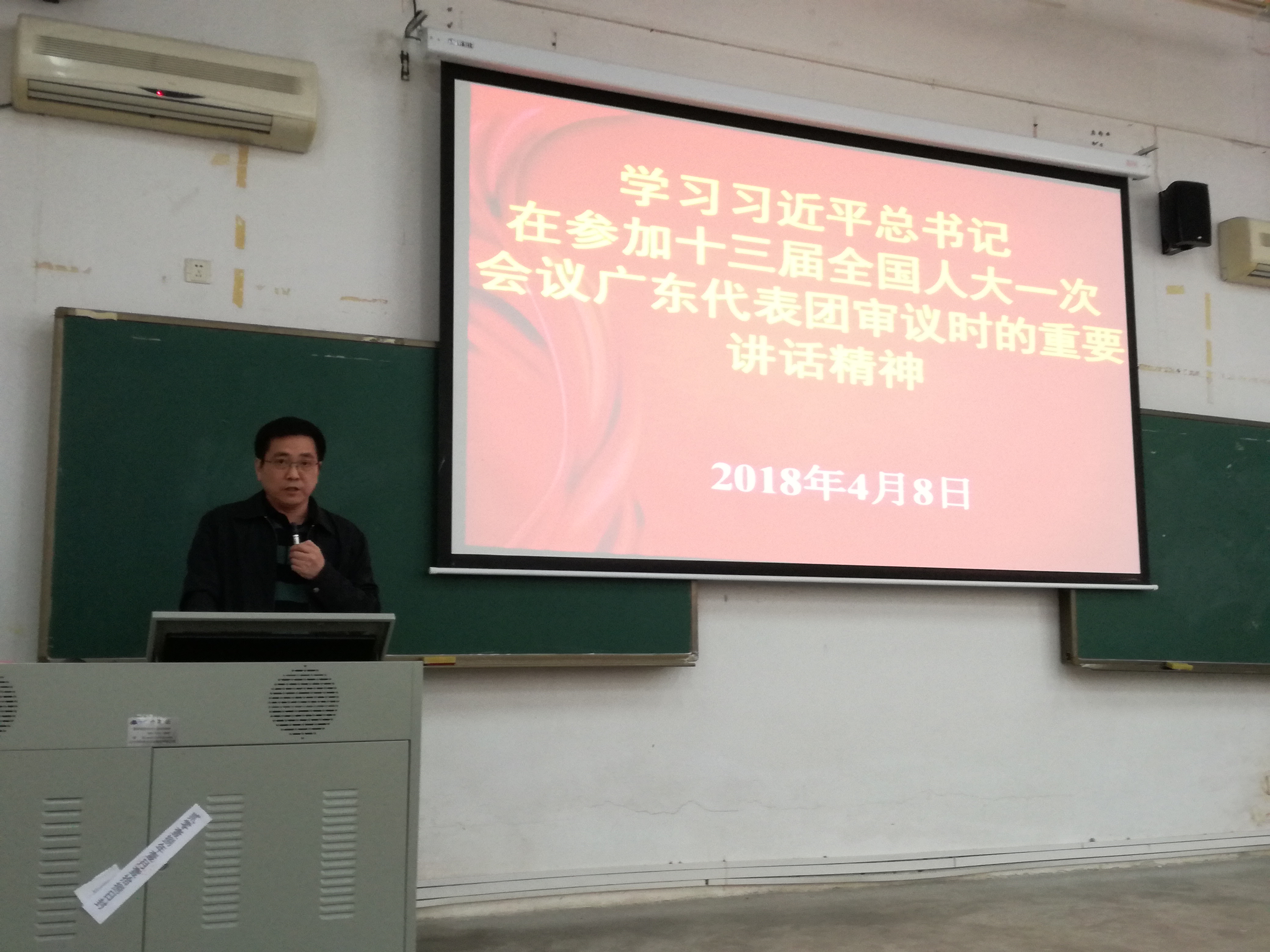 为了进一步加强全体教师和学生党员对习近平总书记在参加十三届全国人大一次会议广东代表团审议时的重要讲话精神的认识,必赢于2018年4月8日下午在6B101教室开展了本次学习会议,全体教师和学生党员出席了本次会议。会议由学院党总支书记钟守炎主持,马克思学院宣讲团郭奕鹏老师主讲并带领我们一起学习了相关重要讲话精神。