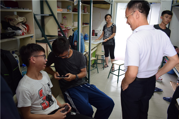 陈书记在走访期间了解到有部分新生学子来自外省,表示各同学都应该包容舍友,将友谊之光发扬光大。走访期间也有许多家长为自己的儿女收拾打扫。对于自己的儿女即将步入大学生活,有的家长表示欣慰,也有的感到担忧。此外,也有的同学早已与舍友打成一片,玩起了各类网络游戏,对此陈书记指出大学生活更应放下手机电脑,走出宿舍,锻炼身体之余更能够广交结友。