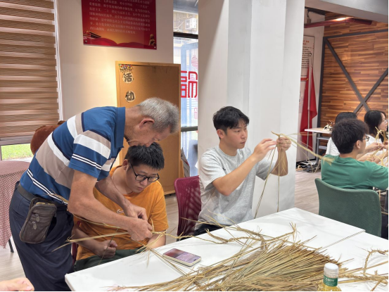 在草龙扎制技艺教学环节,叶淑华老师亲自示范,从挑选材料开始,向学生党员们展示草龙扎制的每一个步骤。她介绍道,草龙的制作材料主要是稻草,这些看似普通的稻草,在匠人的手中却能变成栩栩如生的草龙。叶老师熟练地将稻草整理、捆绑,运用交叉、缠绕等技法,逐步勾勒出草龙的轮廓。她一边操作,一边耐心地讲解每个步骤的要点和技巧,学生党员们围在周围,目不转睛地观看,不时发出阵阵惊叹。