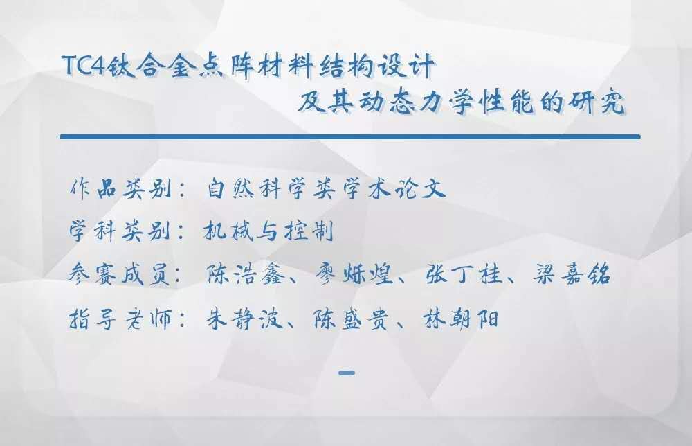 类型三 陈盛贵、林朝阳两位老师协助指导的自然科学类学术论文项目被选入获校级“挑战杯”,题目为《TC4钛合金点阵材料结构设计及其动态力学性能的研究》,参赛学生有陈浩鑫、廖烁煌、张丁桂、梁嘉铭。