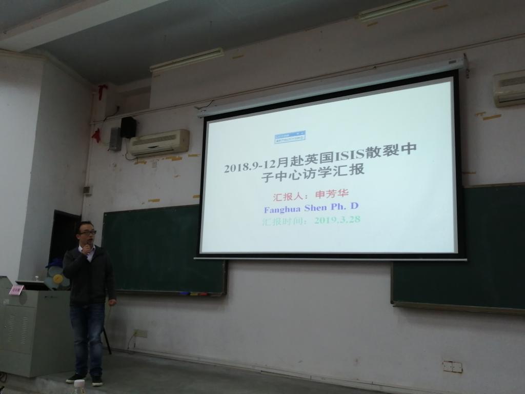 2019年3月28日,必赢首批赴英国散裂中子(ISIS)访学青年老师申芳华、王康、海洋、博士在教学楼6B-102进行了访学成果汇报。院领导孙振忠、钟守炎、黄辉宇、郭建文、陈举铭和学院全体教职工出席报告会。