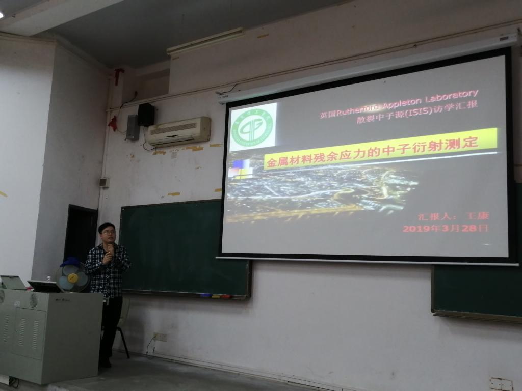 报告会伊始,三位青年老师分别对英国散裂中子源的工程应力谱仪(Eng-X)、成形谱仪(IMAT)和全散射谱仪(Polaris)的功能、参数设置、数据分析等方面进行了深入浅出的讲解。紧接着,结合自身的研究方向,申芳华博士介绍了中子衍射在织构及大型客机航空铝合金领域的研究。王康博士介绍了铸造铝基复合材料凝固过程中的残余应力的研究。海洋博士重点介绍了我校中子全散射多物理谱仪相关的数据分析方法和配套的样品环境设备信息。