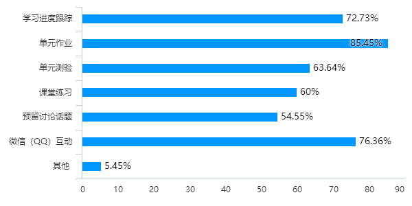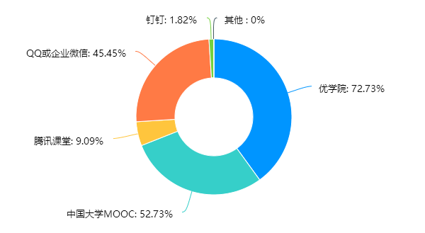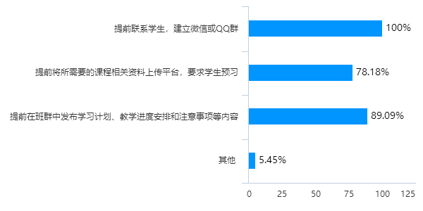 (1)教学准备:学院100%的任课教师在课程开始之前都提前联系了学生,并建立了微信或QQ群,89.09%的教师提前在班群中发布了学习计划、教学进度安排和注意事项、78.18%的教师提前将所需要的课程相关资料上传平台。可见,学院任课教师在课程开课前,都做了充足的教学准备。