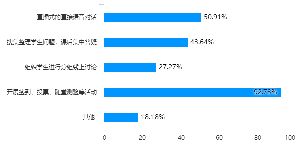 (2)教学互动:调查结果显示,学院任课教师采取多样化的方式与学生在课堂上进行交流互动,其中92.73%的任课教师在线上开展了签到、投票、随堂测验活动,还有教师通过直播式的语音对话;搜集整理学生问题,课后集中答疑;组织学生进行分组讨论,等等。