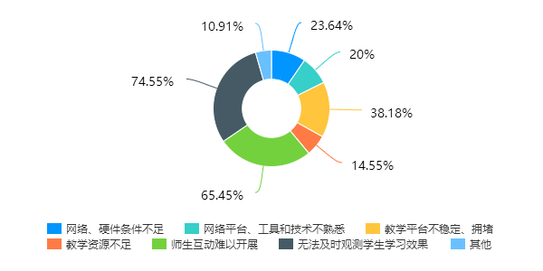 调查问卷结果显示,绝大部分任课教师认为与传统课堂相比,线上教学的教学效果还是难以保证。34.55%的教师认为线上教学的教学效果只能达到传统课堂70%-90%的教学效果,7.27%的教师认为只能达到50%以下的教学效果。这与线上教学“无法及时观测学生学习效果”、“师生互动难以开展”密切相关。教学平台不稳定、拥堵也是亟需解决的问题。