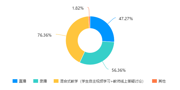 教师开展线上教学的方式,主要包括混合式教学(学生自主视频学习+教师线上答疑讨论)、录播和直播等。一般是采用两种教学方式混合,只使用单一教学方式的较少。
