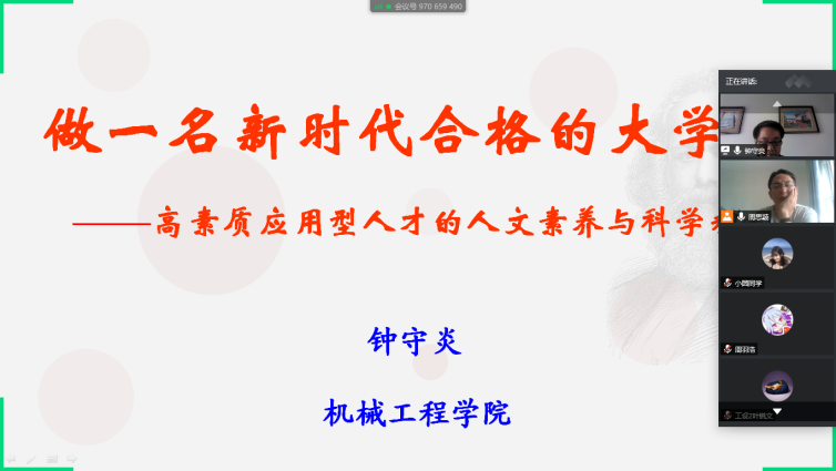 2020年5月26日下午,必赢党委书记钟守炎老师为18工业设计1、2班和18文化产业1、2班的同学上了一堂题为“如何做一名新时代合格的大学生——新时代合格的大学生应该具备的高素质应用型人才的人文素养与科学精神”的思政课。