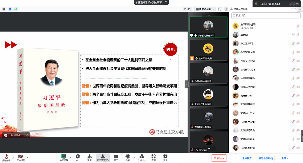 会上,郭家润围绕学习贯彻《习近平谈治国理政》第四卷内容,为全体团学干部讲授了主题团课。郭家润指出《习近平谈治国理政》第四卷,集中展现了习近平总书记在领导党和人民应变局、开新局的伟大实践中提出的一系列原创性的治国理政新理念新思想新战略,展现了马克思主义中国化时代化的最新成果。奋进新征程,建功新时代。广大学生干部要把学习第四卷作为重大政治学习任务,持续在学懂弄通做实上下功夫,坚持先学一步、深学一层。读原著学原文、悟原理知原义,掌握好运用好贯穿其中的立场观点方法,强化学思用贯通,知信行合一。