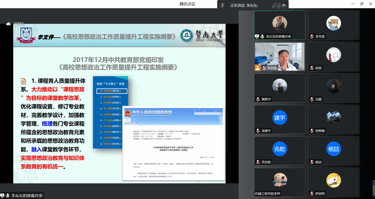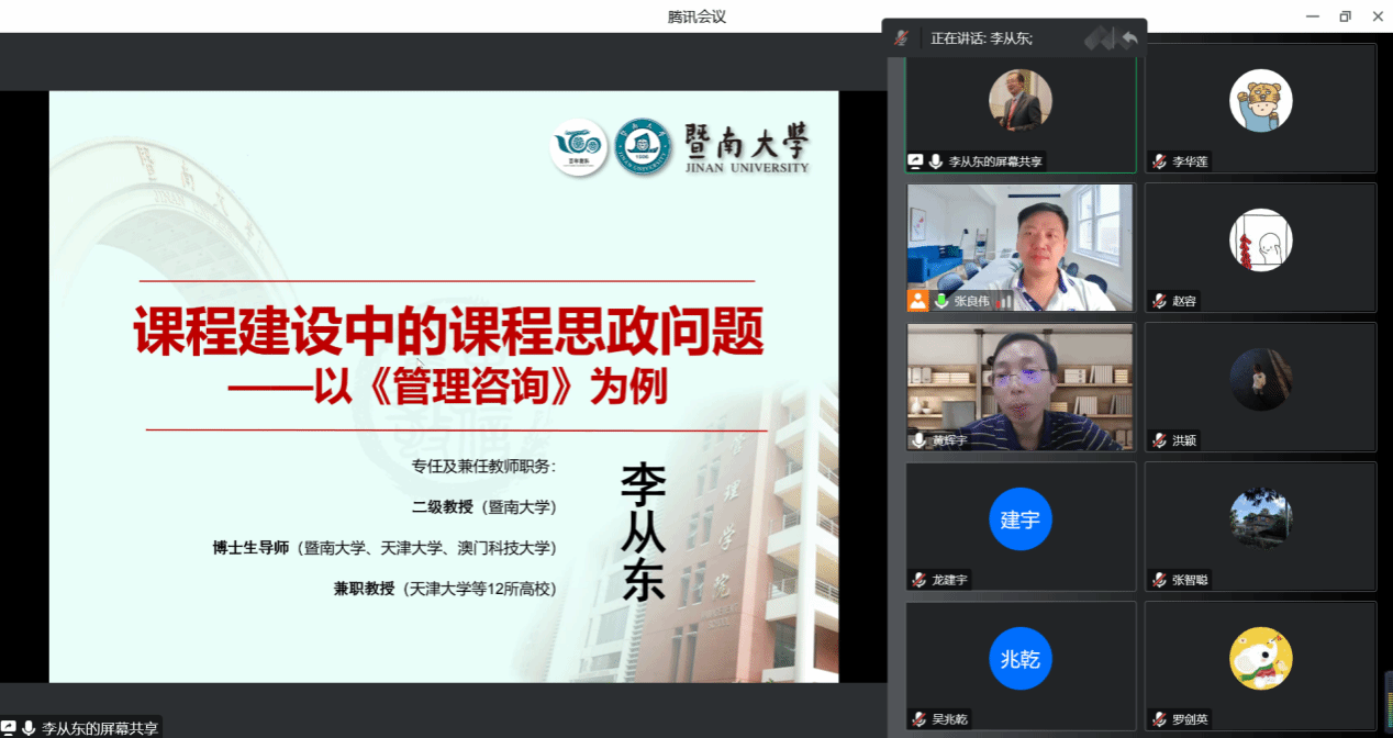 课程思政是新时代高校思想政治教育改革的重点方向。为加强课程思政建设,必赢工业工程系于10月27日开展“课程建设中的课程思政问题——以《管理咨询》为例”为主题的讲座。会议特邀了《管理咨询》国家级一流课程负责人、暨南大学李从东教授进行指导分享。本次讲座以线上的方式开展,由工业工程系主任张良伟主持,必赢副院长黄辉宇和工业工程系全体教师线上参与。